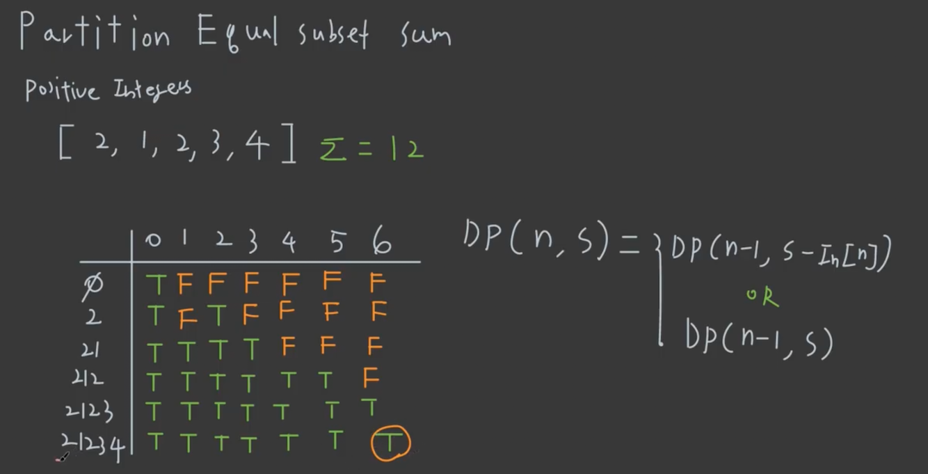 - 두 subset으로 분류할 때 기준은, nums를 전부 합하고 나누기 2 해준 값이 되는지 체크하면 됨.